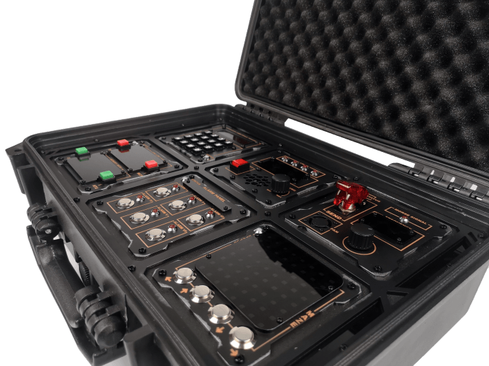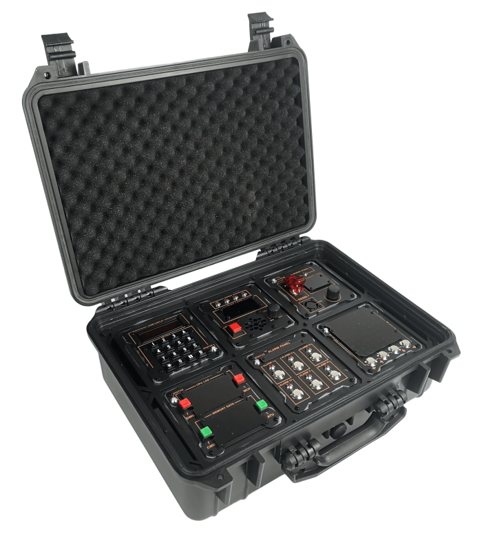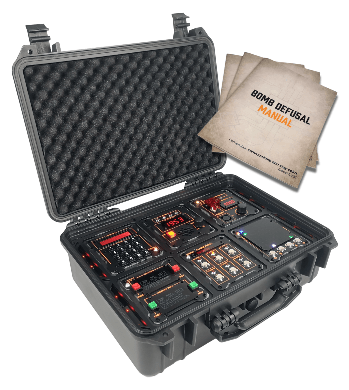 One player faces the prop as the defuser — they can see the bomb but not the manual. The second player is the expert — they have the manual but can't see the prop. The two must communicate to disarm all five modules before time runs out.