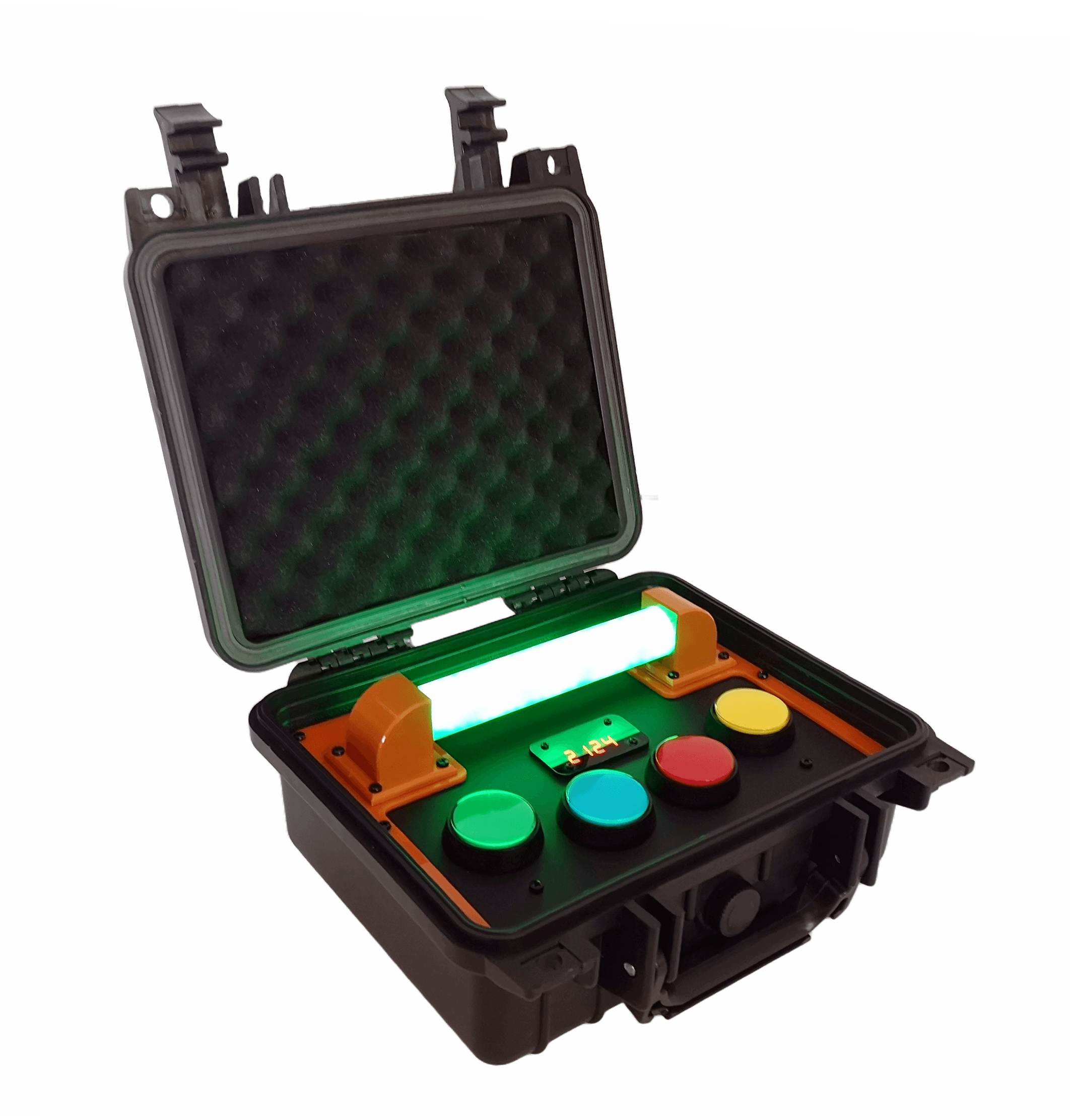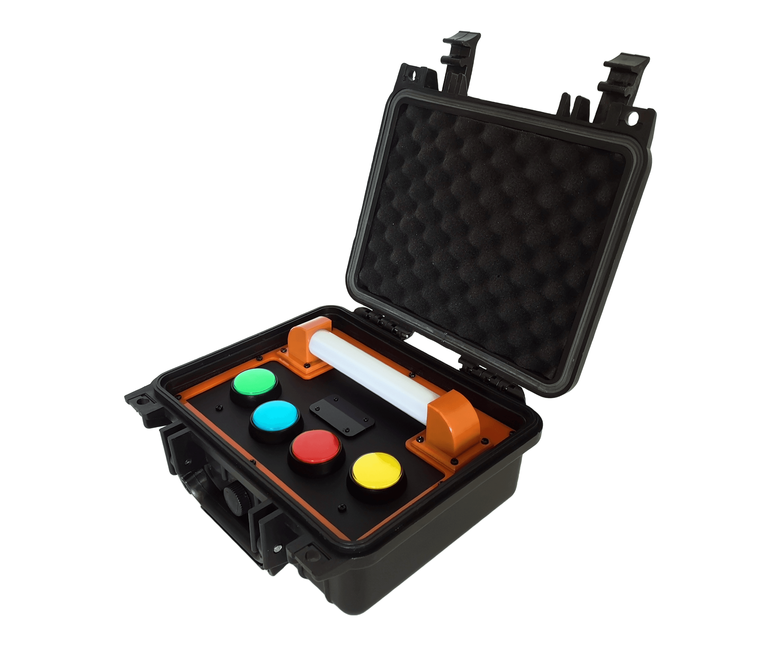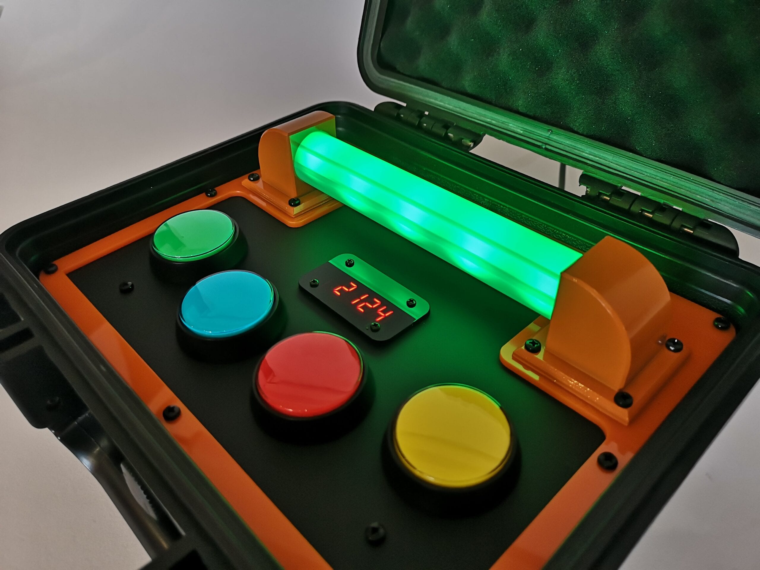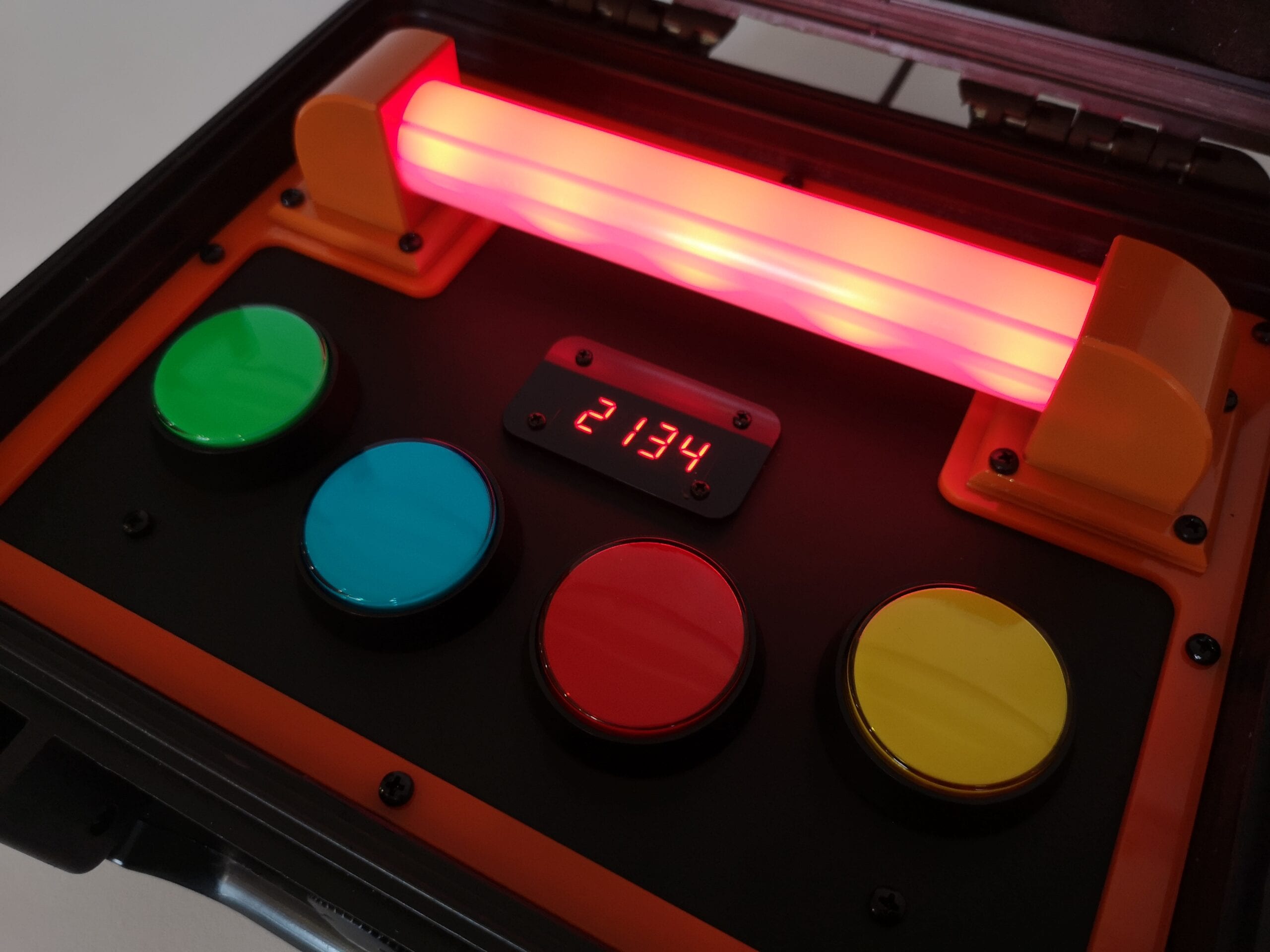 Players repeat a growing sequence on four coloured buttons. When the sequence is completed, a customizable 1–4 digit code is revealed on the display. Works standalone or as part of a larger EX-Core flow. Compact durable Expander-style case, ideal for events and portable setups.